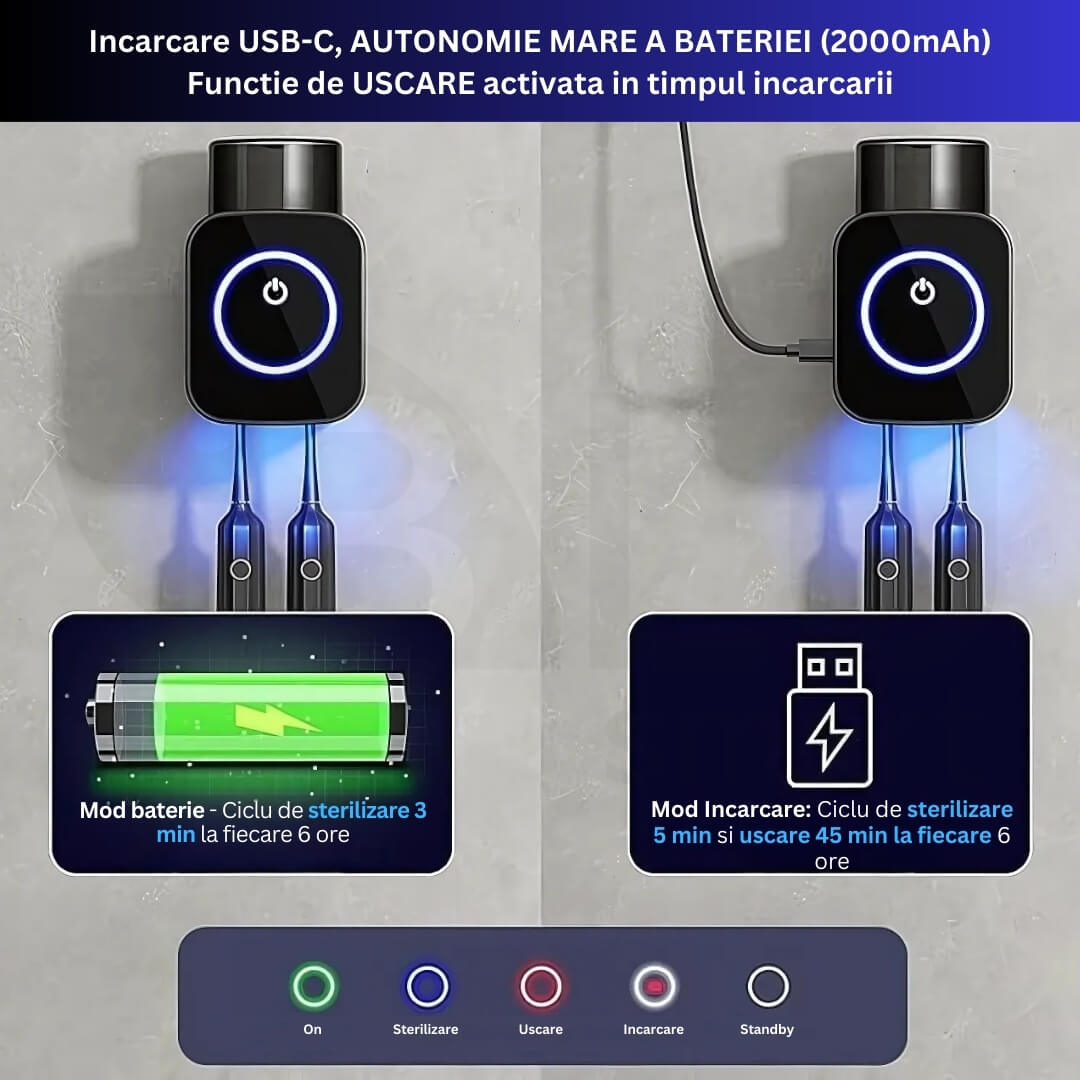 Sterilizatorul utilizează aer cald pentru uscarea periuțelor între utilizări și dispune de încărcare solară, pentru a prelungi viața bateriei. Lampa UV puternică (UVA și UVC) oferă o igienă de lungă durată.