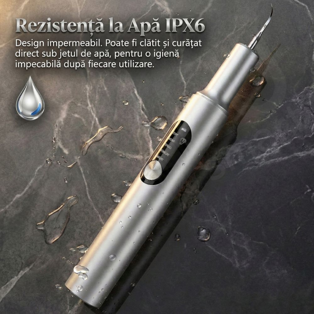 • Dispozitivul activează rezonanța ultrasonică doar la contactul cu suprafețe dure (dinte, piatră).