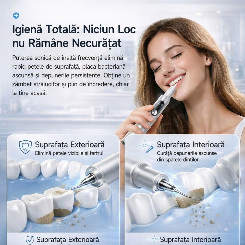 Tehnologia ultrasonică elimină tartrul și placa bacteriană fără a afecta smalțul.