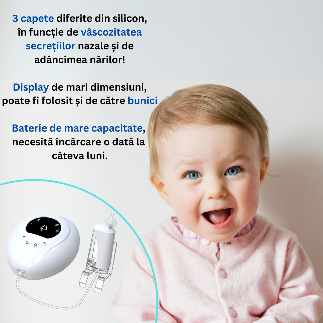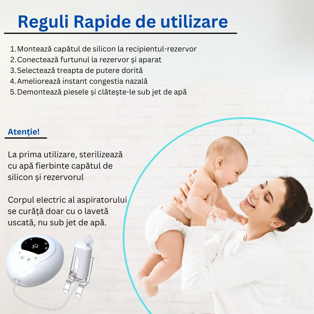 Aspiratorul nazal este un produs conceput exclusiv pentru igiena personală zilnică și confort. Nu este un dispozitiv medical și nu este menit să trateze, să prevină sau să vindece nicio boală sau afecțiune. În cazul răcelilor persistente, congestiilor nazale severe sau oricăror alte probleme de sănătate, vă recomandăm să consultați un medic specialist pentru un diagnostic corect și un tratament adecvat.