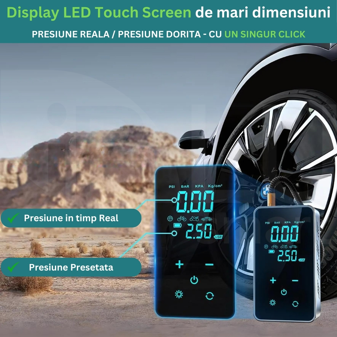 Beneficiezi de funcționalități multiple într-un singur dispozitiv. Cu lumină LED integrată, funcție Power Bank, interval de presiune între 101 și 150PSI, alimentare la 12V și oprire automată, compresorul devine un companion de nelipsit pentru orice călătorie. Poate fi utilizat oricând, atât pentru pneuri de mașină, cât și de motocicletă, bicicletă sau chiar pentru umflarea jucăriilor gonflabile.