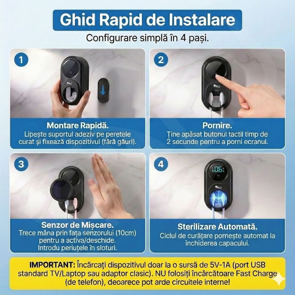 ⚡ Mod Conectat (La Priză): Performanță Maximă. Când este conectat la cablu, activează Programul Intensiv: 5 minute de sterilizare profundă + 180 de minute de uscare continuă cu ventilatorul, asigurând periuțe perfect uscate ca noi.