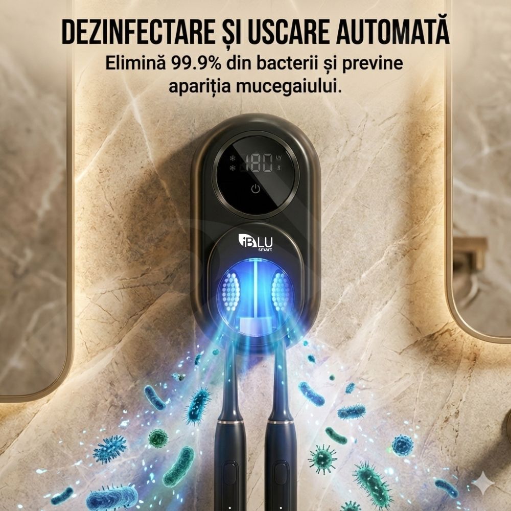 🛡️ Periuțe curate, fără atingere. Sterilizatorul UV iBLU elimină 99,9% din bacterii și oferă uscare activă cu ventilator pentru igienă completă.