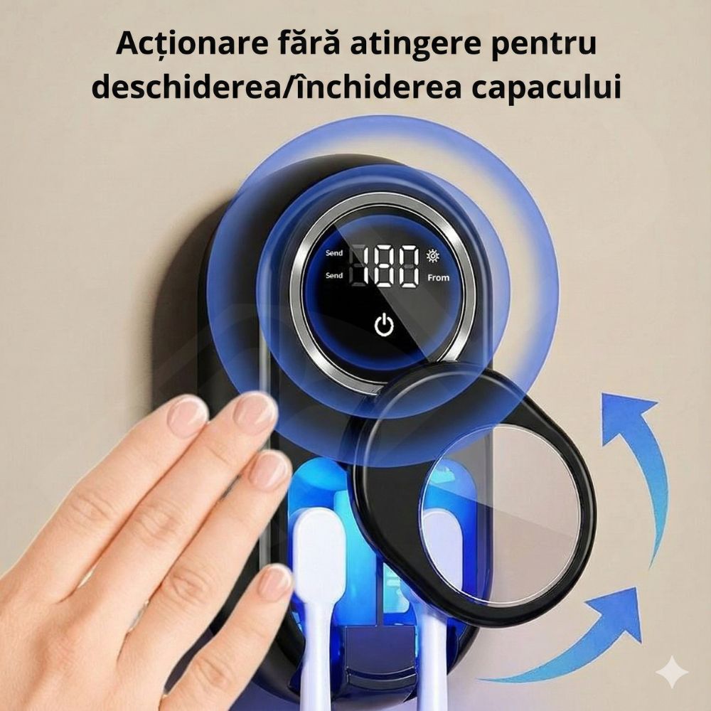 Cum funcționează: Pur și simplu trece mâna prin fața senzorului (distanță 5-10 cm), iar ușa glisantă (Revolving Door) se va deschide automat, permițându-ți să iei sau să pui periuța fără să atingi aparatul.